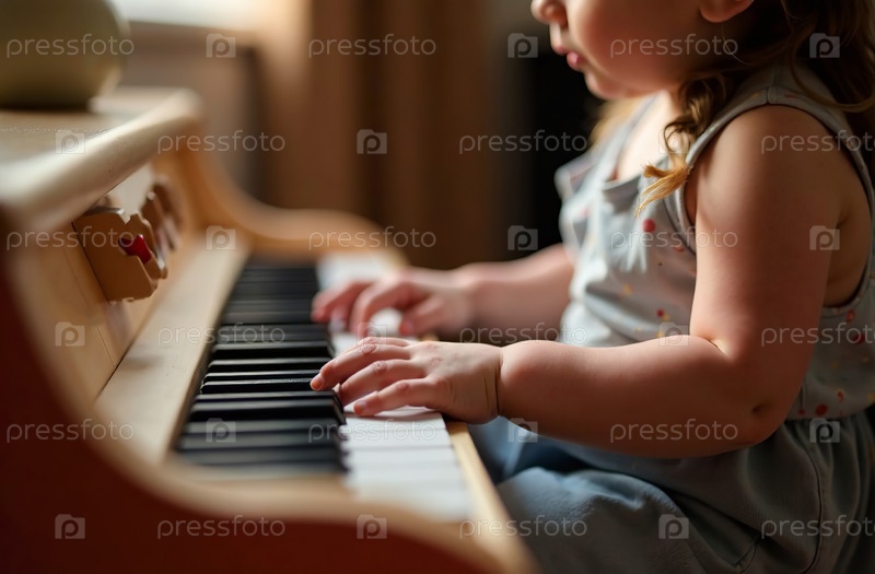 Ребенок играет на игрушечном пианино, молодой музыкант играет музыку в игровой комнате. Генеративный искусственный интеллект