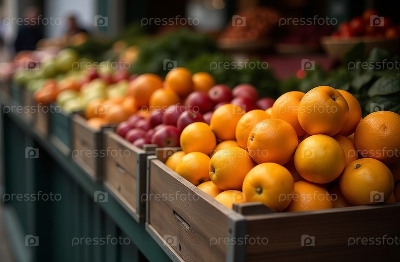 Фруктовый прилавок на рынке, фрукты в деревянных ящиках в магазине, торговый центр. Генеративный искусственный интеллект