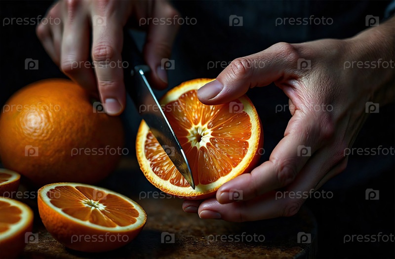 Повар режет апельсины на кухне, готовит еду в ресторане. Генеративный искусственный интеллект