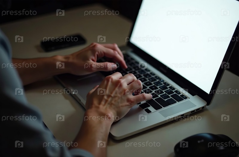 Женщина-работница Работа на ноутбуке в офисе, удаленная работа на ноутбуке. Генеративный искусственный интеллект
