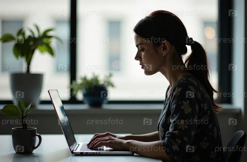 Женщина-работница Работа на ноутбуке в офисе, удаленная работа на ноутбуке. Генеративный искусственный интеллект