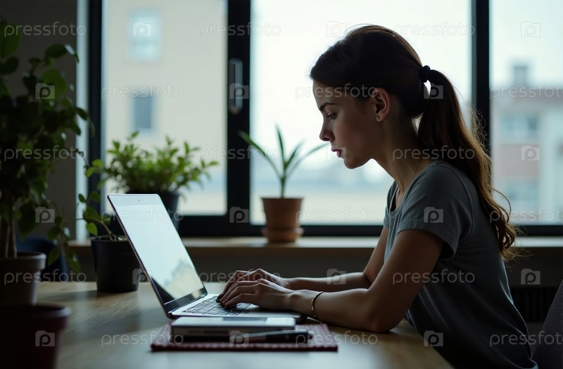 Женщина-работница Работа на ноутбуке в офисе, удаленная работа на ноутбуке. Генеративный искусственный интеллект