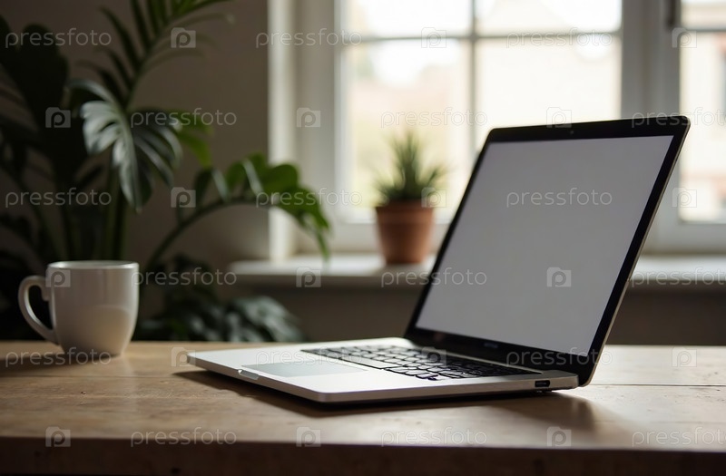 Офисный стол для ноутбука, удаленная работа на ноутбуке, центр открытого пространства. Генеративный искусственный интеллект