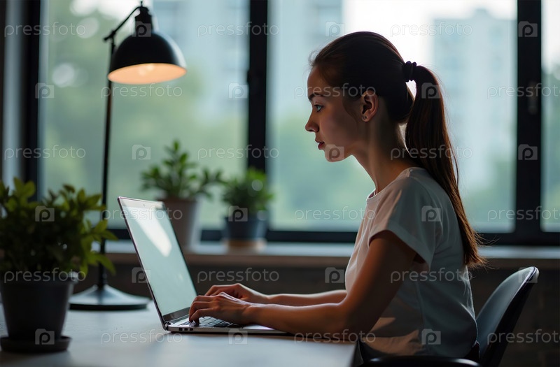Женщина-работница Работа на ноутбуке в офисе, удаленная работа на ноутбуке. Генеративный искусственный интеллект