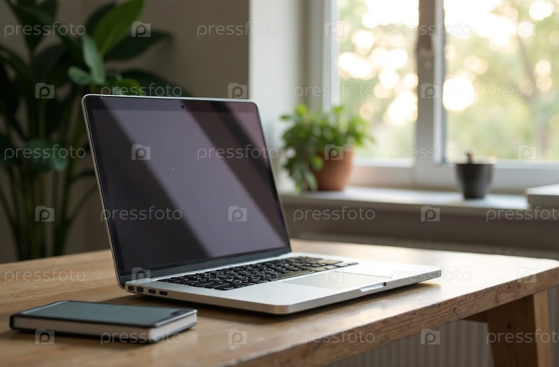 Офисный стол для ноутбука, удаленная работа на ноутбуке, центр открытого пространства. Генеративный искусственный интеллект