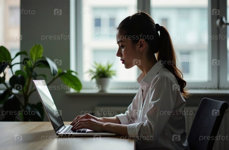 Женщина-работница Работа на ноутбуке в офисе, удаленная работа на ноутбуке. Генеративный искусственный интеллект