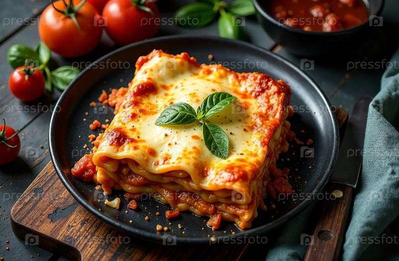 Кусок лазаньи на темном фоне, фото еды Итальянский ресторан. Генеративный искусственный интеллект