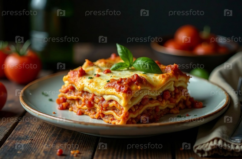 Кусок лазаньи на темном фоне, фото еды Итальянский ресторан. Генеративный искусственный интеллект