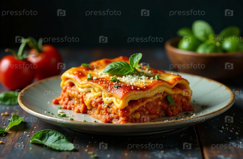 Кусок лазаньи на темном фоне, фото еды Итальянский ресторан. Генеративный искусственный интеллект