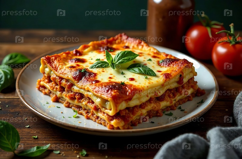 Кусок лазаньи на темном фоне, фото еды Итальянский ресторан. Генеративный искусственный интеллект