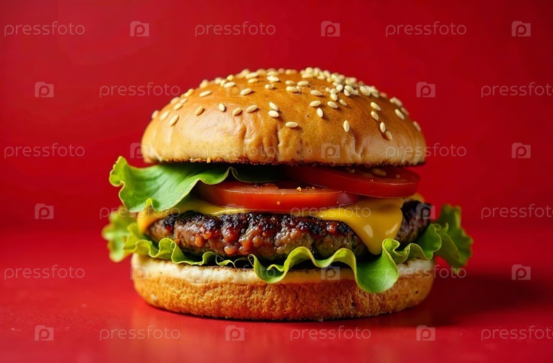 Сочная котлета бургера на красном фоне. Еда для меню ресторана. Генеративный ИИ