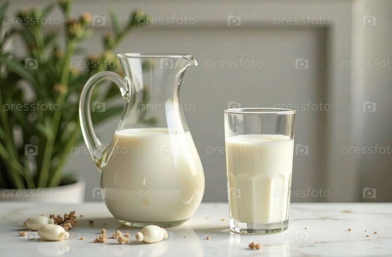 Кувшин и стакан молока светлый фон, фото напитка ресторан. Генеративный искусственный интеллект