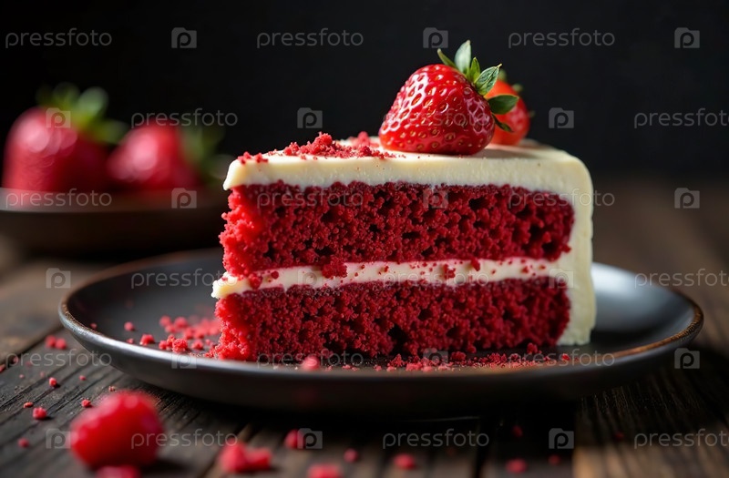 Кусочек торта красный бархат темный фон, десерт фото ресторан. Генеративный искусственный интеллект