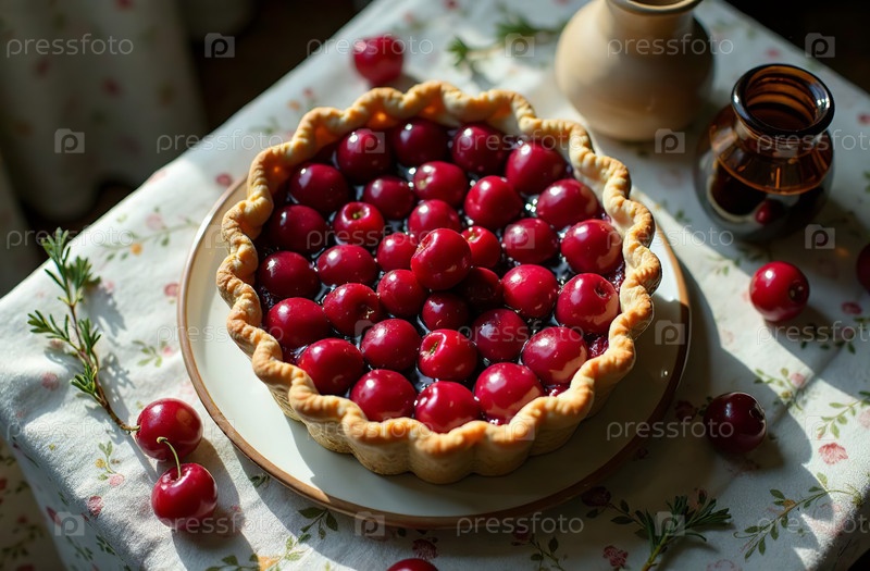 Целый фруктовый вишневый торт, фотография десерта для пекарни-ресторана. Генеративный искусственный интеллект