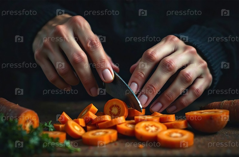 Повар режет морковь на кухне, готовит еду в ресторане. Генеративный искусственный интеллект