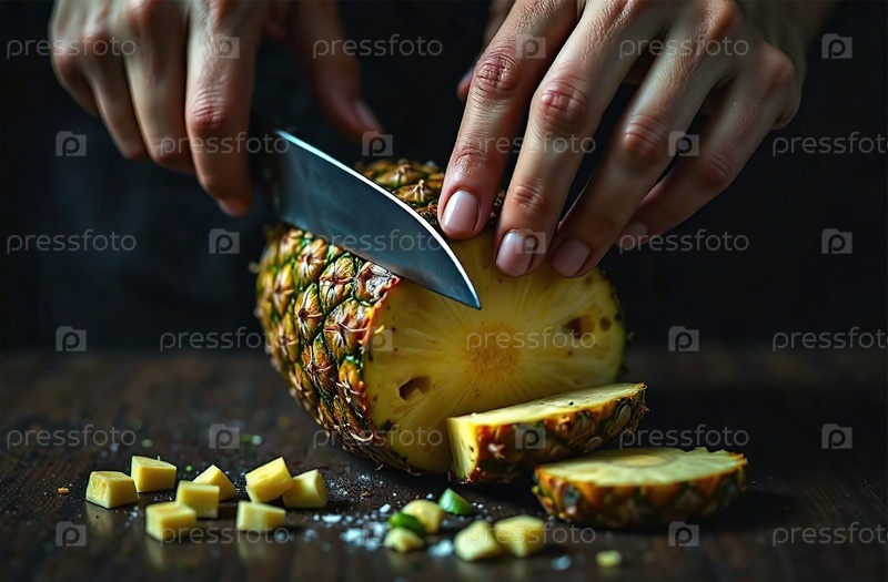 Повар режет ананас на кухне, готовит еду в ресторане. Генеративный искусственный интеллект