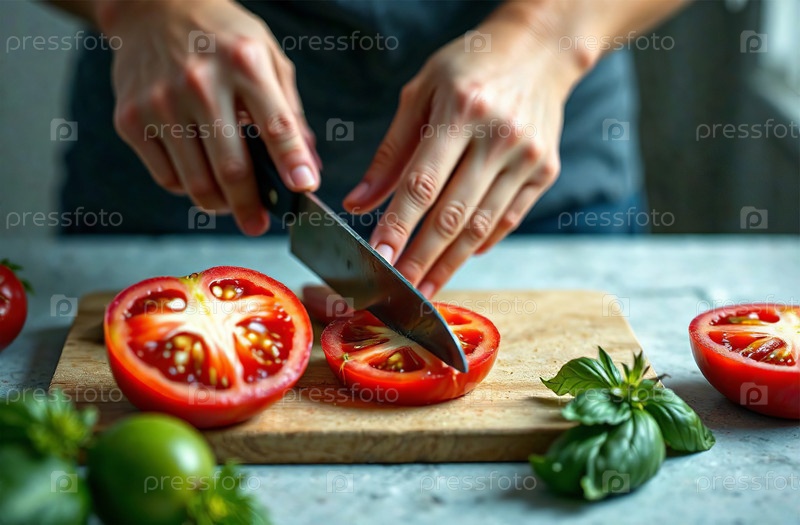 Повар режет помидоры на кухне, готовит еду в ресторане. Генеративный искусственный интеллект