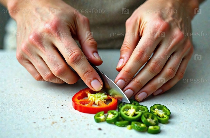 Повар режет перец овощ на кухне, готовит еду в ресторане. Генеративный искусственный интеллект