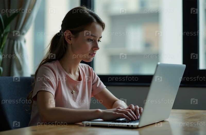 Женщина-работница Работа на ноутбуке в офисе, удаленная работа на ноутбуке. Генеративный искусственный интеллект