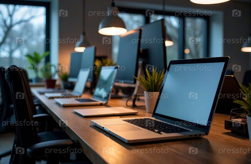 Офисный стол для ноутбука, удаленная работа на ноутбуке, центр открытого пространства. Генеративный искусственный интеллект