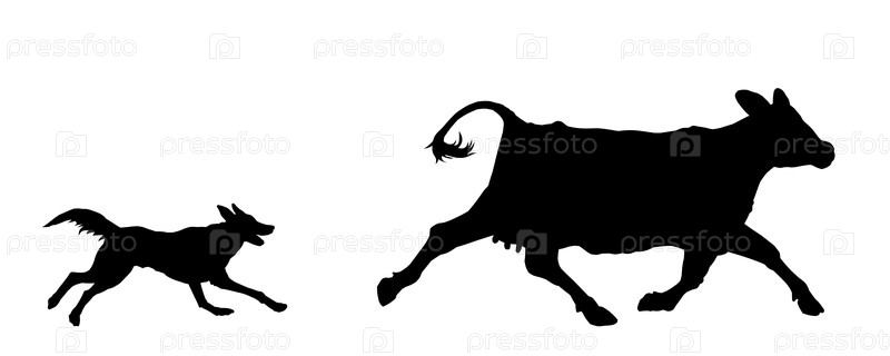 Силуэт погони собаки за коровой