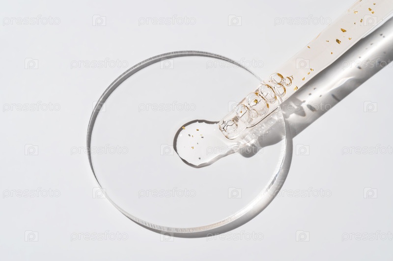 Косметическая пипетка с 24-каратным золотым маслом на белом фоне крупным планом. Стильная концепция органических эссенций, товаров для красоты и здоровья. Современная аптека. Крупным планом