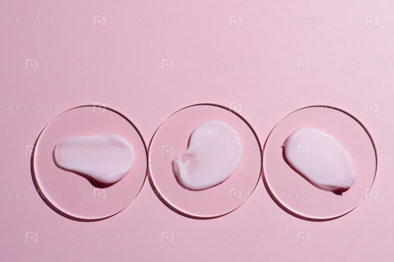 Мазок кремовых мазков в чашке петри на розовом фоне. Концепция лабораторных испытаний и исследований, изготовление и тестирование косметических средств