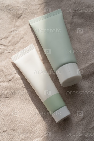 Макет двух пластиковых бутылок для выдавливания для брендинга лекарств или косметики - крема, геля, средств по уходу за кожей, зубной пасты. Косметический контейнер для бутылок на бежевом фоне из хлопчатобумажной ткани. Минимализм
