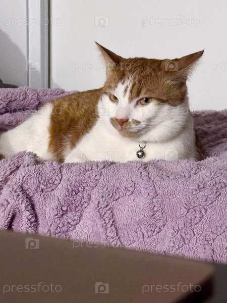 На диване лежит рыжий кот с белой шерстью