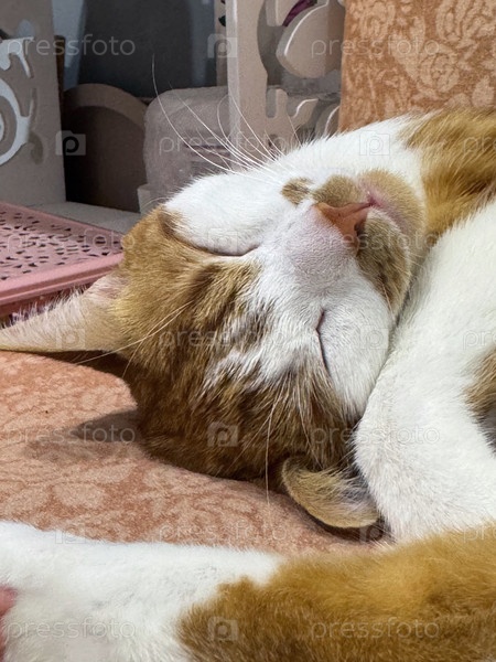 Рыжий кот с белой шерстью. Спит на боку. Крупный план головы
