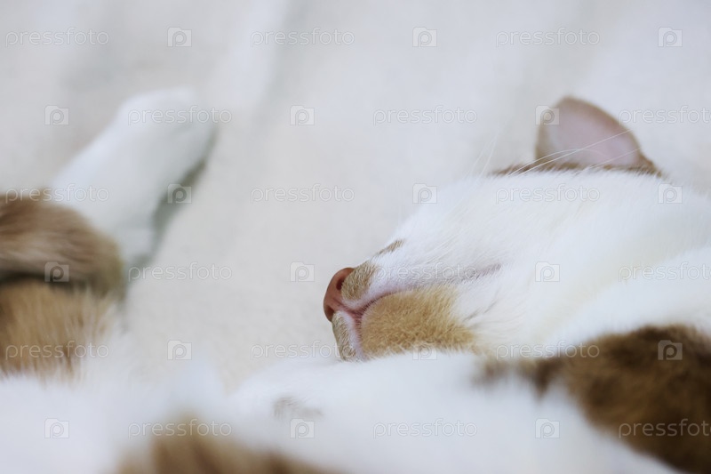 Рыжий кот с белой шерстью. Спит на боку. В причудливой позе. Крупный план головы