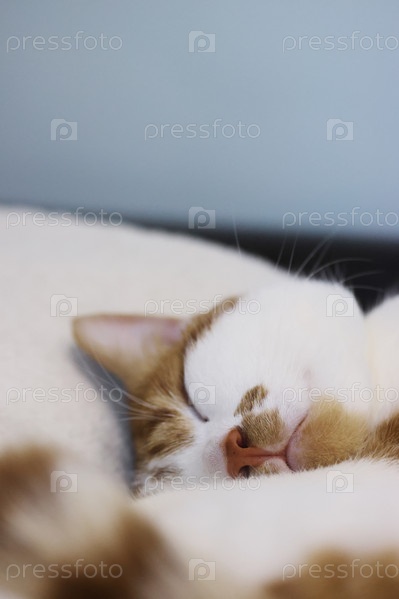 Рыжий кот с белой шерстью. Спит на боку. В причудливой позе. Крупный план головы