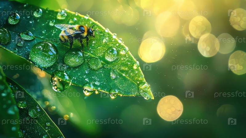 Пчела отдыхает на листе, покрытом росой, под солнечным светом