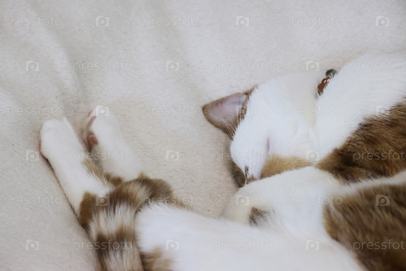 Рыжий кот с белой шерстью. Спит на боку. В причудливой позе. Обернул хвост вокруг задних ног. Крупный план