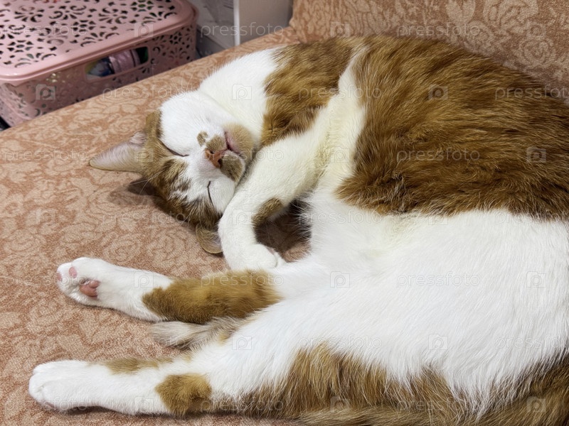 Рыжий кот с белой шерстью. Спит на боку. В причудливой позе. Крупный план
