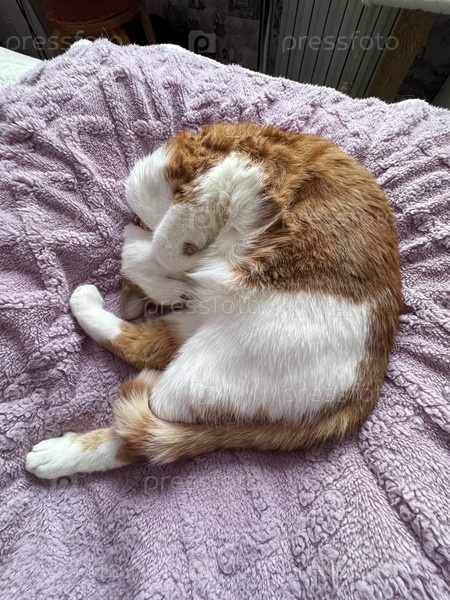Рыжий кот с белой шерстью. Спит на боку. В странной позе. Снимок с высокого ракурса