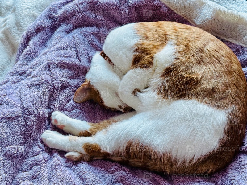 Рыжий кот с белой шерстью. Спит на боку. В причудливой позе. Снимок с верхнего ракурса
