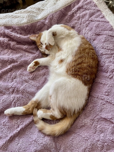 Рыжий кот с белой шерстью. Спит на боку. В причудливой позе. Косой угол