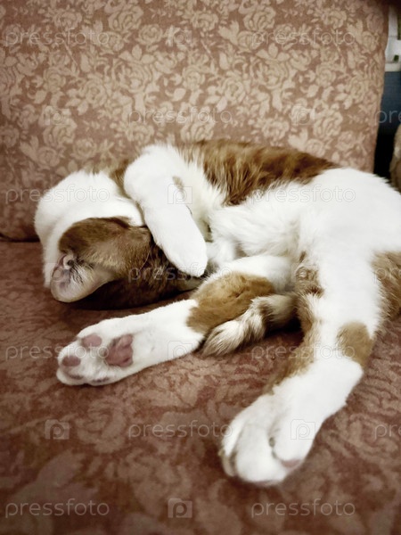 Рыжий кот с белой шерстью. Спит на боку. В странной позе