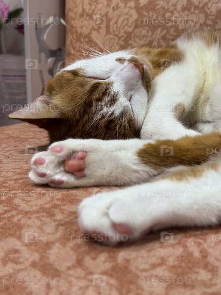 Рыжий кот с белой шерстью. Спит на боку. В причудливой позе