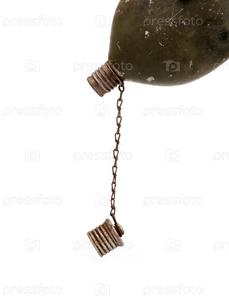 Старинная ржавая военная фляжка, изолированная на белом фоне