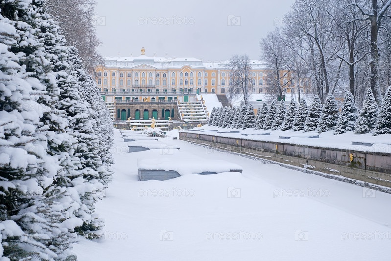 Зимний пейзаж в нижнем парке Петродворце (Петергоф, Санкт-Петергоф). Вид на большой каскад