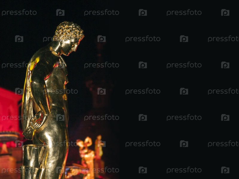 Нижний парк Петродворца, Большой Дворец и Большой каскад (Петергоф, Санкт-Петербург). Ночной пейзаж с яркой иллюминацией скульптуры Большого каскада