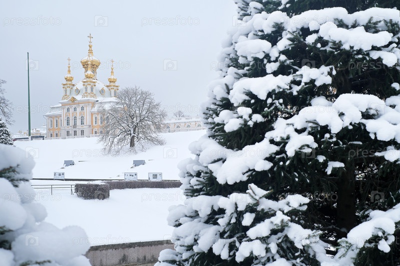 Зимний пейзаж в нижнем парке Петродворце (Петергоф, Санкт-Петергоф). Вид на большой каскад