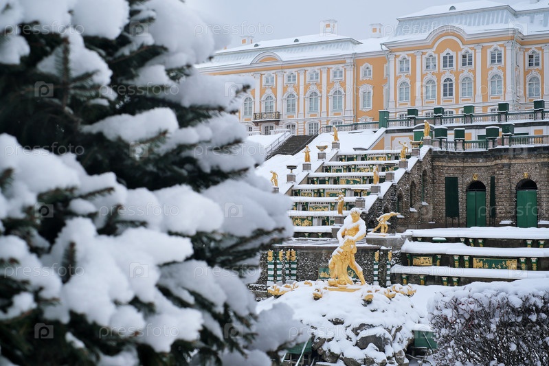 Зимний пейзаж в нижнем парке Петродворце (Петергоф, Санкт-Петергоф). Вид на большой каскад