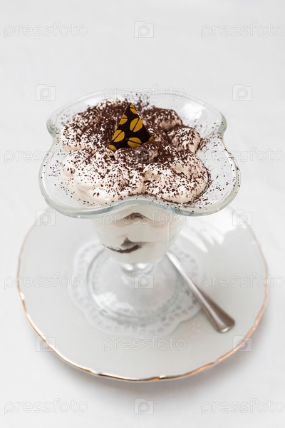 Десерт из бисквита и взбитых сливок в прозрачной креманке на столе