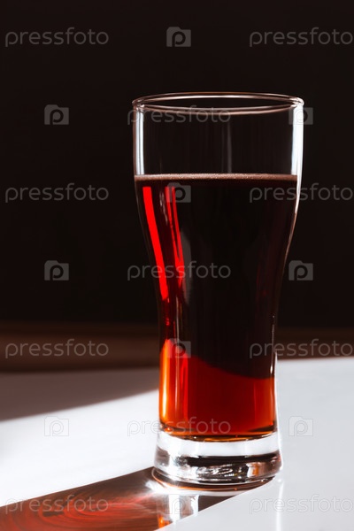 Прохладительный напиток квас, пиво в высоком прозрачном стакане на черно-белом фоне
