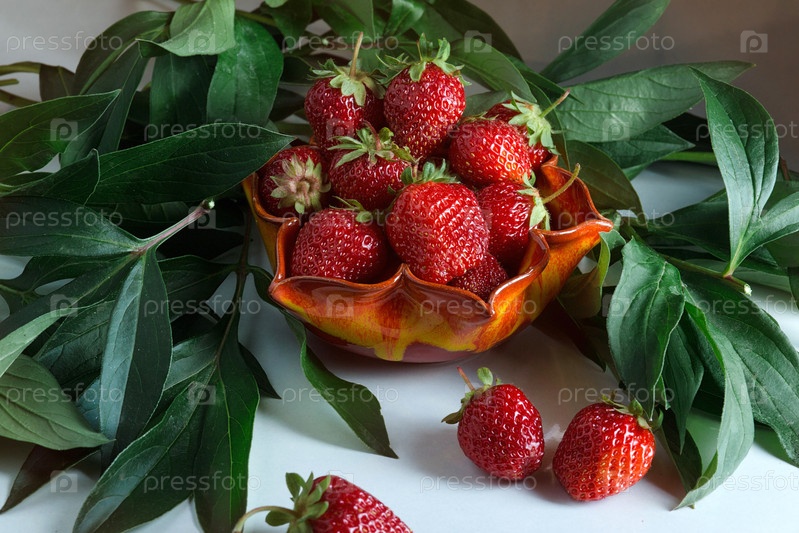 Спелая красная клубника. Ягода в оранжевой вазе