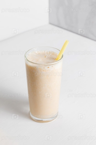 Молочный коктейль с бананом в высоком прозрачном стакане на белом фоне. Полезный напиток для диеты