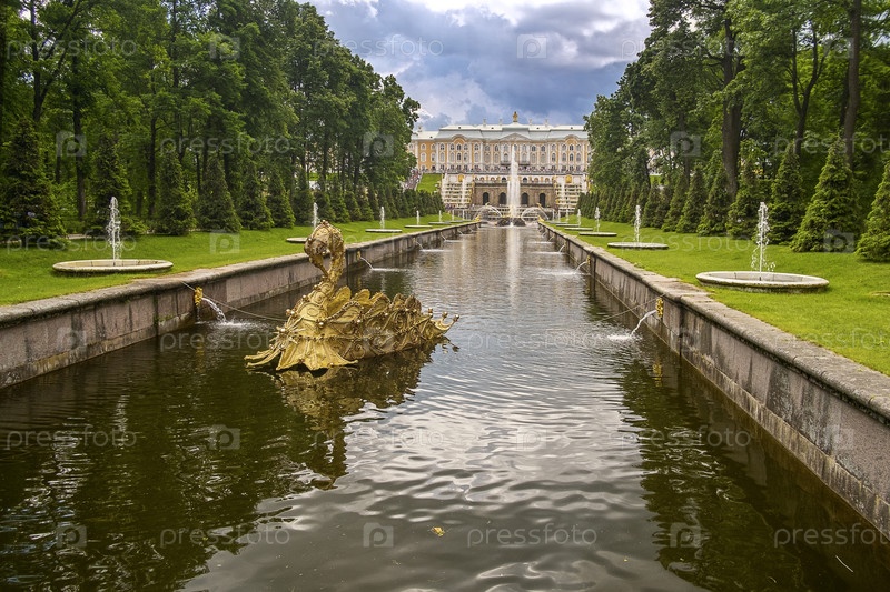 Летний пейзаж с видом на Большой дворец со стороны Морского канала Петергофа, Санкт-Петербург, Россия
